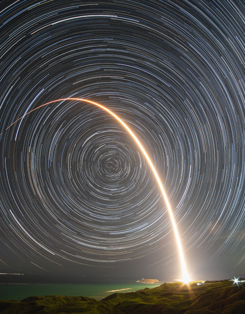 Good morning, Rallypoint, and welcome to the August 17th edition of Astronomy Picture of the Day (APOD). This composite image (50 exposures over 2 1/2 hours) was captured by a camera aimed directly and the South Celestial Pole and frames the launch of an Electron rocket from the Mahia Launch Complex in New Zealand. Mahia is located close to Ahuriri Point on the east coast of New Zealand's North Island. The Electron rocket is a two-stage, partially reusable orbital launch vehicle developed by Rocket Lab, an American aerospace company with facilities in Virginia, New Mexico, Colorado, Maryland, Toronto and New Zealand.