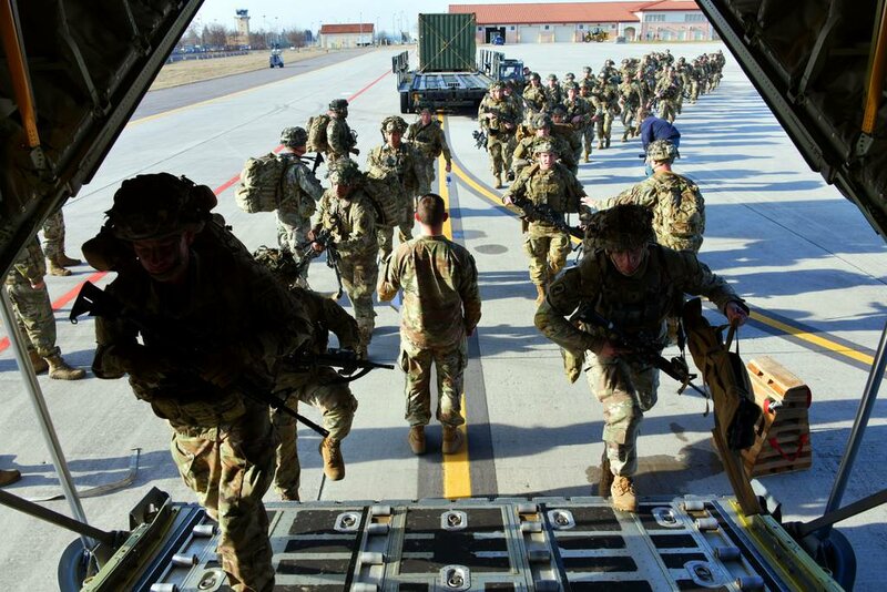 Paratroopers from the 173rd Airborne Brigade board an aircraft to deploy to Latvia, Feb. 23-24, 2022. (Graigg Faggionato/Army)