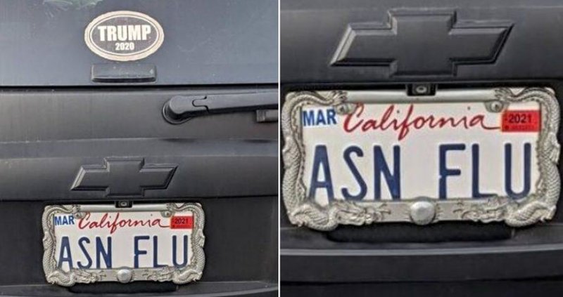 A vehicle registered in California with the license plate “ASN FLU” has sparked outrage after its photo was shared on social media last week.