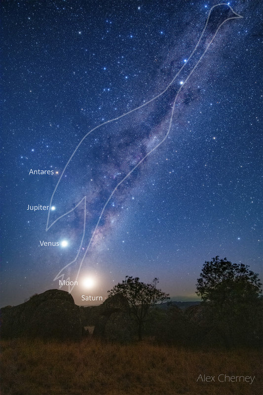 Background from your link: "Explanation: A luminous Milky Way falls toward the horizon in this deep skyscape, starting at the top of the frame from the stars of the Southern Cross and the dark Coalsack Nebula. Captured in the dark predawn of February 2nd from Central Victoria, Australia, planet Earth, the 26 day old waning crescent Moon still shines brightly near the horizon. The second and third brightest celestial beacons are Venus and Jupiter along the lower part of the Milky Way's central bulge. Almost in line with the brighter planets and Moon, Saturn is the pinprick of light just visible below and right of the lunar glow. Australia's first astronomers saw the elongated, bulging shape of the familiar Milky Way as a great celestial Emu. The Moon and planets could almost be the Emu's eggs on this starry night."