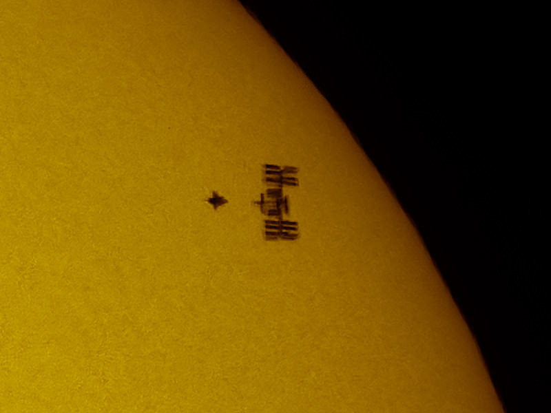 COL Mikel J. Burroughs Here's a similar picture, only this one is of the shuttle Atlantis and ISS transiting the Sun in 2010.