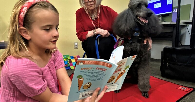 As kids flock to libraries for summer reading programs, one of the most popular programs is Read to a Dog. Children get ten minutes to read a book of their choice to a therapy dog — or sometimes cat — trained to listen and watch calmly and without judgment.