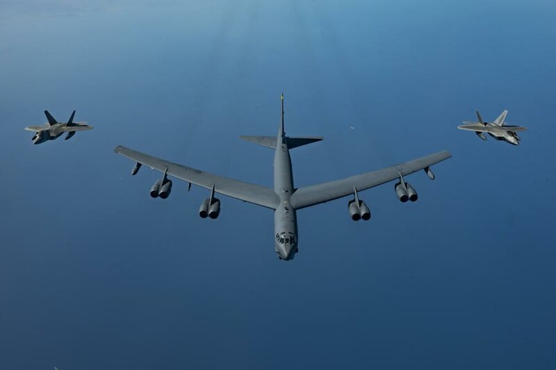 Excellent view of B-52 and companions (and terraine) I remember going with Mom during the Korean Conflict to a room above the fire station in the town where we lived (of ~1500) where a few ladies did shift work to look for bombers in the sky. And we would see B-52 fly by . . . from Fairchild AFB (in Spokane), usually quite low still. being ~ 50 miles from there. Dad was called back to Hanford for active duty - so I was a BRAT for a while. Nothing like it, lol. Nothing like the B-52, either.