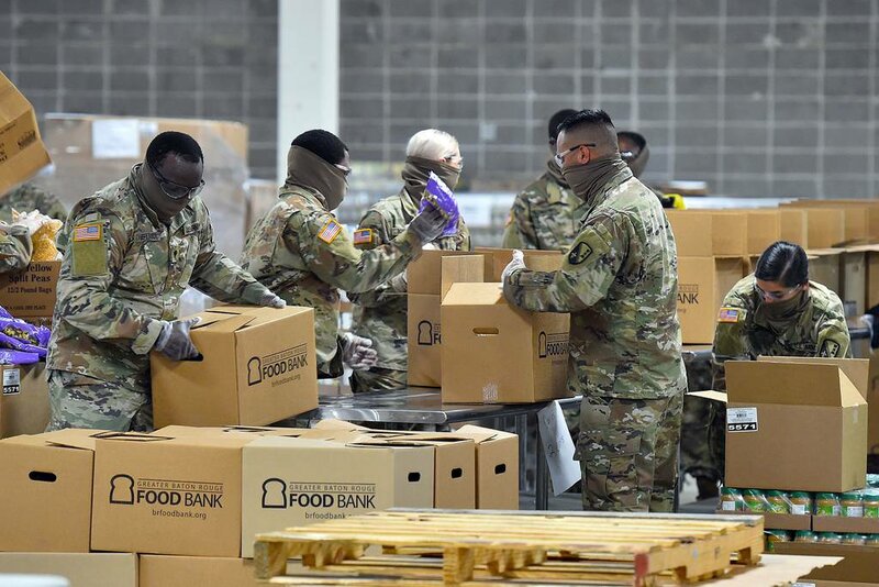 Louisiana National Guard soldiers preparing food boxes for distribution in the local area during the COVID-19 response in Baton Rouge, Louisiana, April 23, 2020. (Air Force/Master Sgt. Toby Valadie)