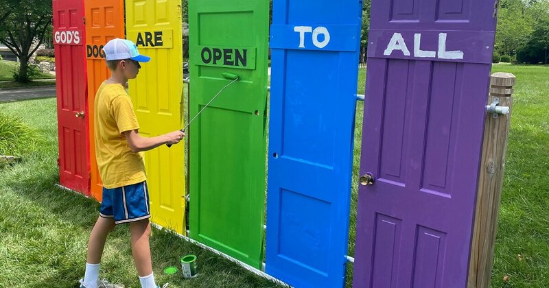 Six brightly colored doors, inscribed in black and white lettering with the phrase, “God’s doors are open to all” stand in front of the Kansas City United Church of Christ in Brookside — a tribute to the church’s long standing acceptance of the LGBTQ+ community. But in an overnight act of vandalism Wednesday, the words “pervs” and “repentance” were scrawled across the doors in big, white lettering. The church’s pride flag was also stripped from its flagpole and stolen.