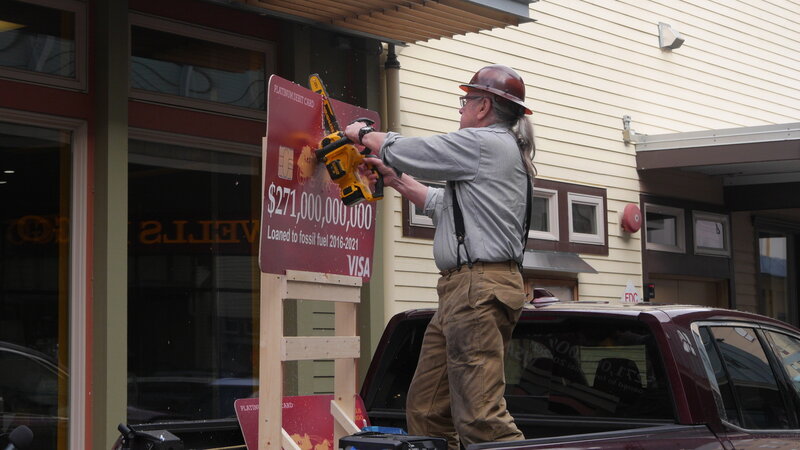 Across the U.S., people protested outside major banks on Tuesday, calling on financial institutions to shift investments away from fossil fuel companies. In Boston, more than 200 people marched from a Chase Bank to a Bank of America branch. A man there used a solar-powered chain saw to cut through giant credit cards from Chase and Bank of America.