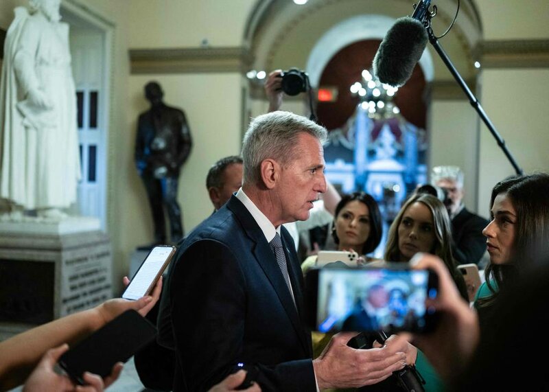 US Speaker of the House Kevin McCarthy, Republican of California, speaks to the press before going to the House chamber to vote on a continuing resolution on Capitol Hill in Washington, DC on September 30, 2023. (Photo by ANDREW CABALLERO-REYNOLDS / AFP) (Photo by ANDREW CABALLERO-REYNOLDS/AFP via Getty Images)