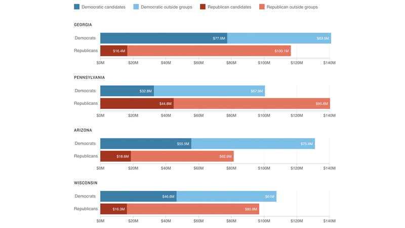 More than $1.6 billion has been spent or booked on TV ads in a dozen Senate races, with $3 out of every $4 being spent in six states — Georgia, Pennsylvania, Arizona, Wisconsin, Nevada and Ohio, according to an NPR analysis of data provided by the ad-tracking firm AdImpact.