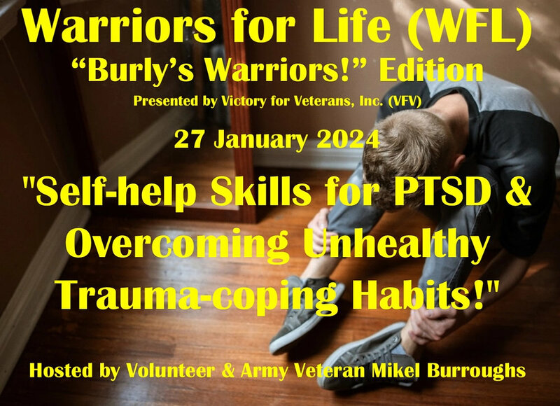 Warriors for Life (WFL) Online, presented by Victory for Veterans, Inc. (VFV) — Saturday (TONIGHT), 27 January 2024 at 4:30 PM PT, 5:30 PM MT, 6:30 PM CT, and 7:30 PM ET