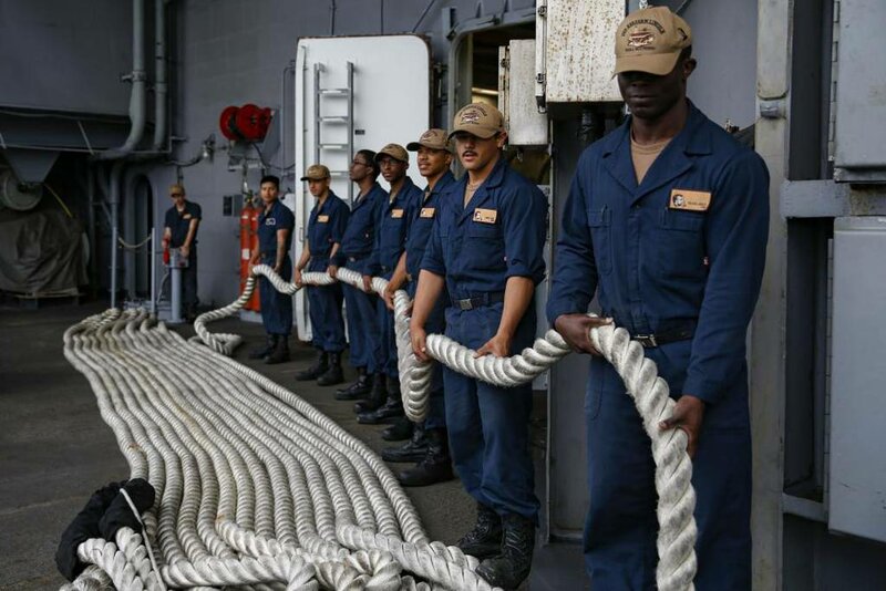 Sailors aboard the aircraft carrier Abraham Lincoln prepare to slack lines on the fantail Oct. 3 as the ship pulls into San Diego. E. coli bacteria was recently found in the ship's water. (MC3 Han Puyu/Navy)