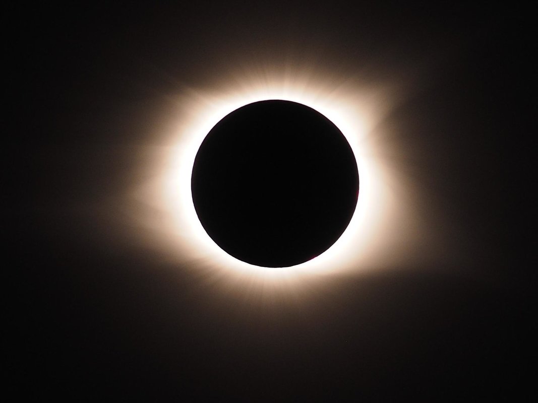 With the bright body of the sun covered by the moon, the fainter solar corona glows in all its glory. The far brighter light streaming from the body of the sun usually outshines the corona, which is about the same brightness as the full moon.