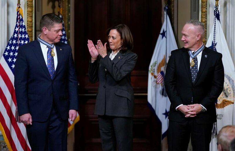 Vice President Kamala Harris applauds after presenting the Congressional Space Medal of Honor to former NASA astronauts Robert Behnken, left, and Douglas Hurley on Jan. 31, 2023. (Patrick Semansky/AP)