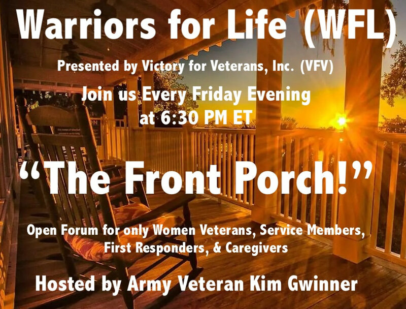 Join our Volunteer Army Veteran Kim Gwinner every Friday Evening for “The Front Porch!” women’s only Warriors for Life (WFL) Online Group Support, sponsored & presented by Victory for Veterans, Inc. Where all types of Women Warriors get together for genuine camaraderie, different topics, friendship, and supportive discussions.