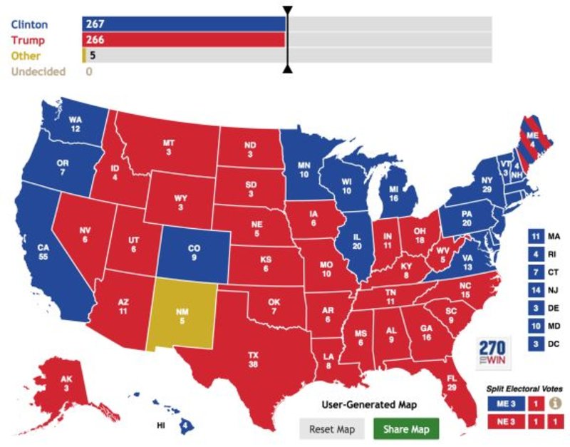 He states about a 0.4% chance. Not very likely but it would certainly lead to some lively discussion and an interesting situation. The House of Representatives would them choose between Trump, Hillary and Johnson with each state delegation getting a single vote. I'd put my money on Trump at that point.