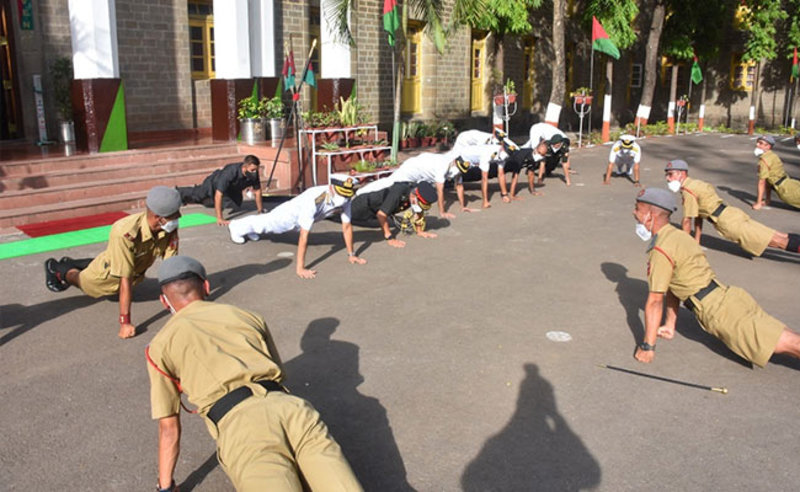 Their caps and masks in place, they all went about the exercise with Admiral Singh leading the charge. Some young cadets could be seen doing the knuckle push ups.