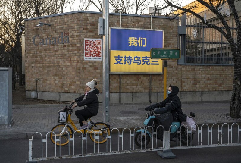 Image: Women ride by a large Ukrainian flag with the slogan "We Support Ukraine" written on it in Chinese characters on the outside wall of the Canadian Embassy in Beijing, China, on March 1, 2022.
