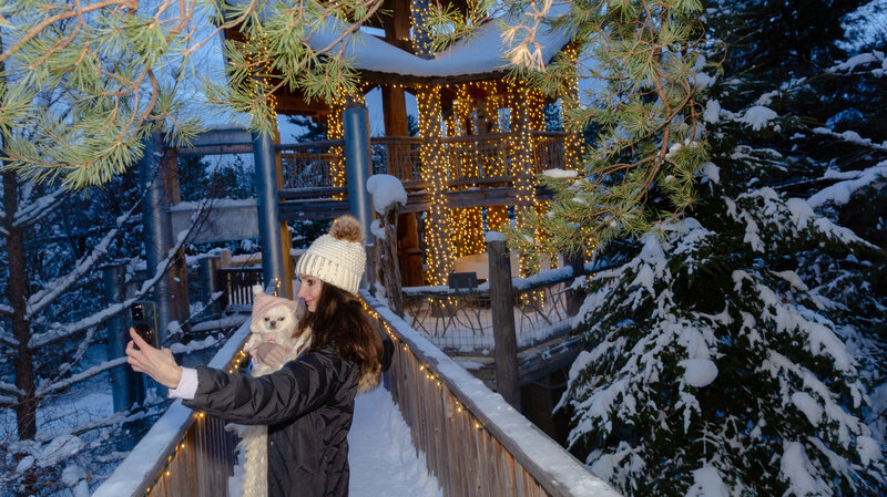 But as we set off across a snow-covered bridge, the path is luminous, decked in glittering white bulbs.