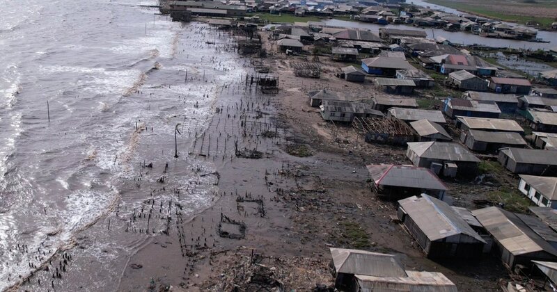 Buildings have sunk into the Atlantic Ocean, an increasingly common image along the vulnerable West African coast. Old timber pokes from the waves like rotten teeth. Shattered foundations line the shore. Waves break against abandoned electrical poles.