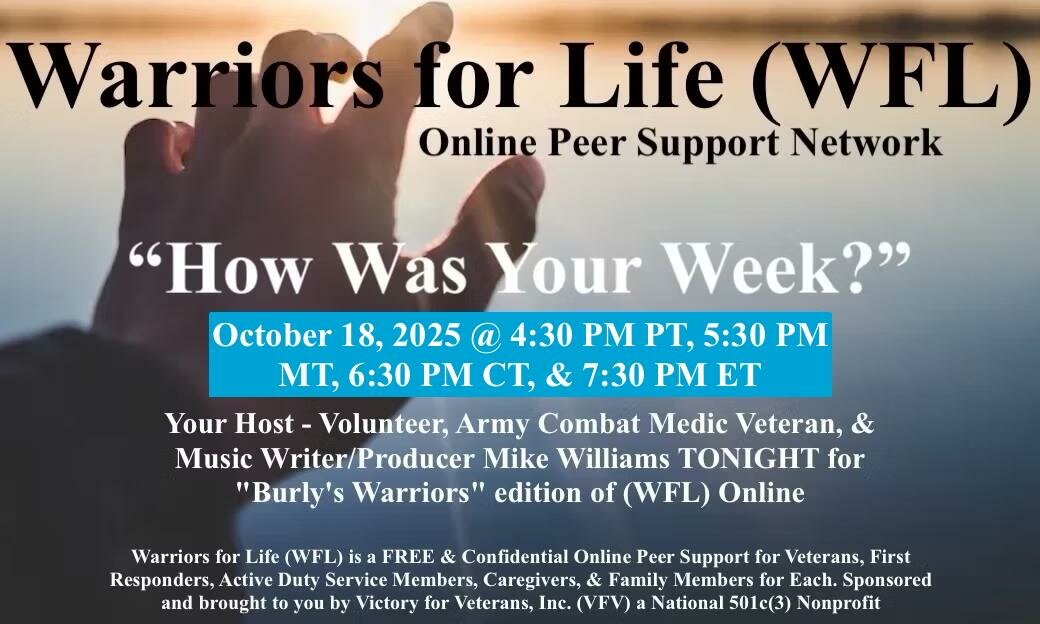 Warriors for Life (WFL) Peer Support Network Online "Burly's Warriors" edition, presented by Victory for Veterans, Inc. (VFV) — (TONIGHT), October 18, 2025 @ 4:30 PM PT, 5:30 PM MT, 6:30 PM CT, & 7:30 PM ET
