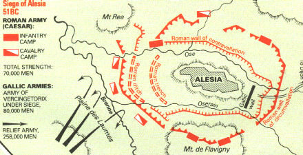 B. 58 BC The Battle of Alesia, Caesar's Greatest Victory "Alesia was an oppidum (fortified settlement) on a lofty hill, with two rivers on two different sides. Due to such strong defensive features, Caesar decided on a siege to force surrender by starvation. Considering that about 80,000 men were garrisoned in Alesia, together with the local civilian population, this would not have taken long. To guarantee a perfect blockade, Caesar ordered the construction of an encircling set of fortifications, a circumvallation, around Alesia. It was eleven Roman miles long (16 km, each mile equivalent to around 1,000 left-foot steps, meaning one stepped with their right, then left) long and had 24 redoubts (towers). While work was in progress, the Gauls carried out cavalry sallies to disrupt the construction. Caesar placed the legions in front of the camp in case of a sally by the infantry and got his Germanic allies to pursue the Gallic cavalry.