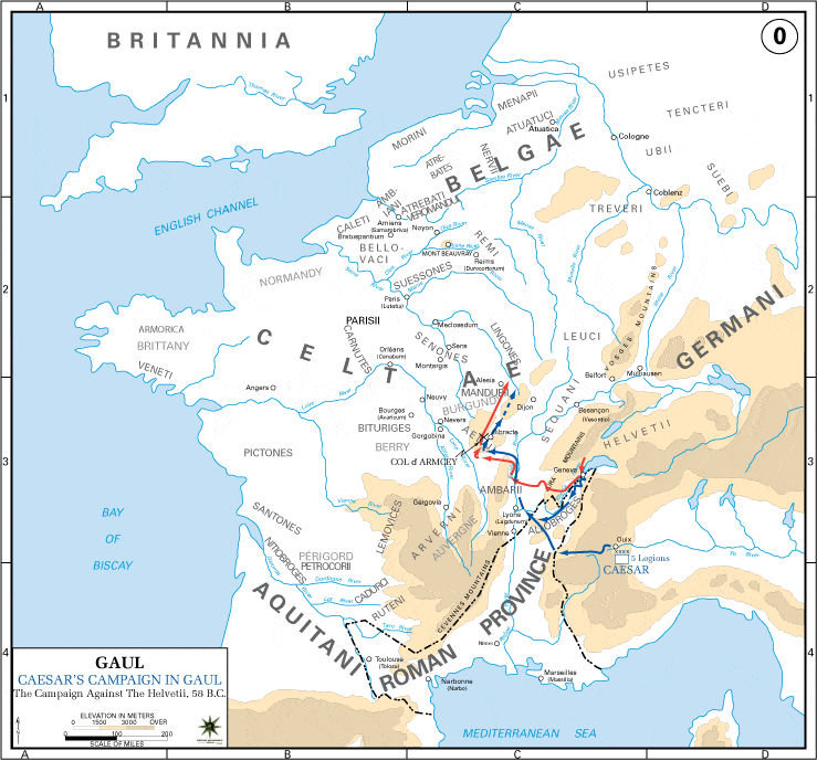 C. A map of Caesar's campaign against the Helvetii in Gaul, 58 BC.