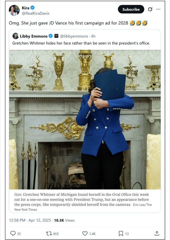 I love what she did when the press was allowed in. What a loser!