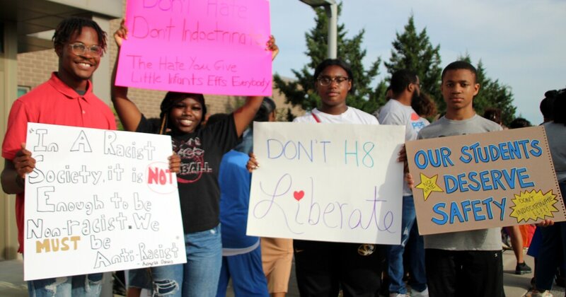 Lee's Summit students and parents rallied with signs and pride flags to protest a group of students' efforts to start a club affiliated with Turning Point USA.
