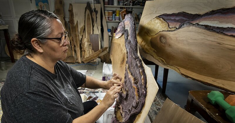 The Indigenous artist is among 19 local artists creating work for the new Kansas City airport, scheduled to open next year. For her piece, Cliff has spent months attaching millions of tiny beads to several pieces of raw-edge wood. The final work will be 17 feet long.