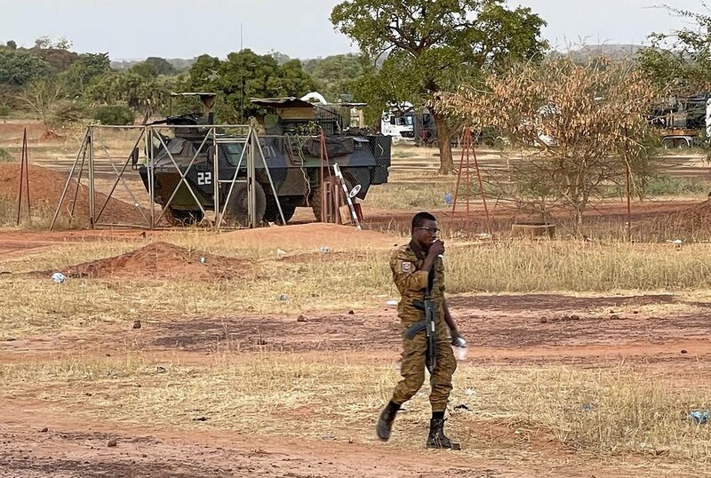 A Burkinabe soldier walks past a French Armoured Personnel Carrier part of a French military convoy heading to Niger, stopped by protesters in Kaya, Burkina Faso, Saturday Nov. 20, 2021. (AP Photo/Sam Mednick)