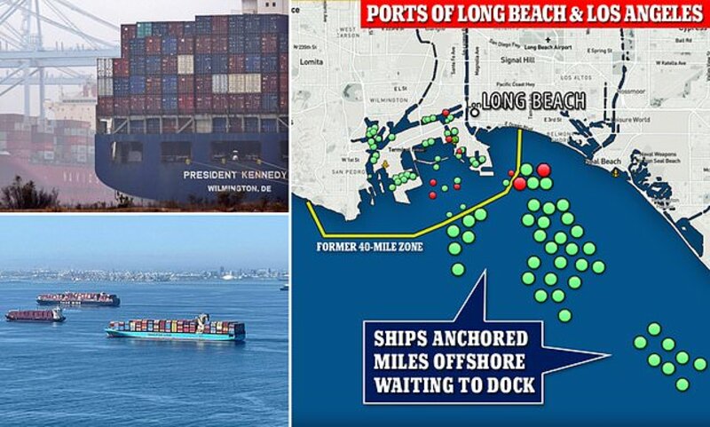 12/6/21 Still a supply crisis: According ship-tracking website MarineTraffic, there are currently nearly 100 cargo ships waiting to dock at the two popular ports in California, which have seen unprecedented bottlenecks during the US' current supply chain crisis.