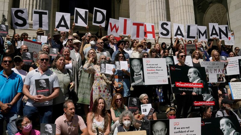 On the steps of New York Public Library, such prominent writers as Paul Auster, Gay Talese and Kiran Desai drew from Salman Rushdie's own words to express their solidarity with the 75-year-old after he was brutally attacked at a literary event in western New York.