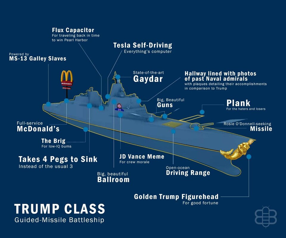 I don't know why a ship that's 3x the size of a destroyer and 1/4 the size of a carrier is needed, maybe it has to do with the volume of space required for the equipment that runs the pair of lasers the Trump Class will mount? That's the only thing that makes sense to me, the larger missile magazine isn't a satisfactory answer on its own... What baffles me is that it will burn fossil fuel. I would expect a small nuke plant, especially with the power the lasers will need. Turning oil into beams of energy doesn't seem especially efficient!