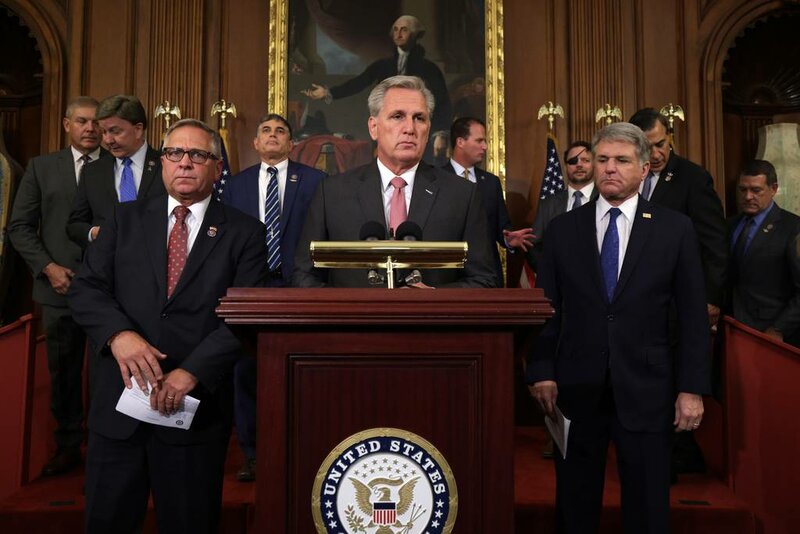 Rep. Kevin McCarthy, R-Calif., speaks at an August 2021 news conference at the U.S. Capitol with Rep. Mike Bost, R-Ill., at his right. Behind Bost is Rep. Mike Rogers, R-Ala. (Alex Wong/Getty)