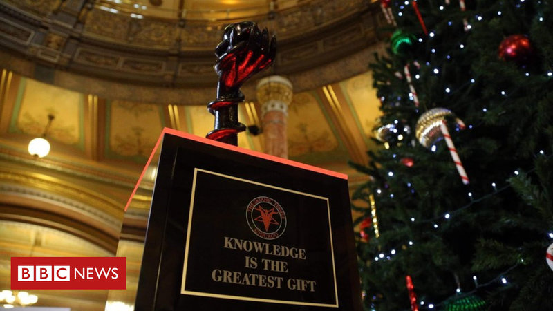 Satanic Temple Protests Ten Commandments Monument With Goat-Headed Statue