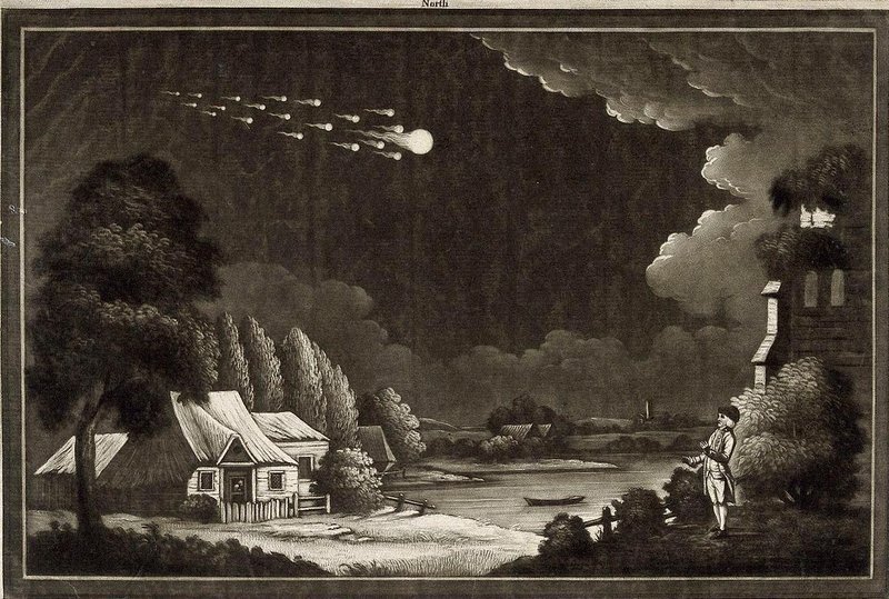 An artist's rendering of a meteor passing over the British Isles in 1783. Unlike the L'Aigle meteor a few decades later, the meteorites from this event were not witnessed falling to the ground, and thus meteorites remained a scientific mystery for another 20 years. (Wellcome Images)