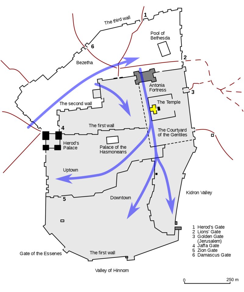 "The Siege of Jerusalem in the year 70 CE was the decisive event of the First Jewish–Roman War. The Roman army, led by the future Emperor Titus, with Tiberius Julius Alexander as his second-in-command, besieged and conquered the city of Jerusalem, which had been controlled by Judean rebel factions since 66 CE, following the Jerusalem riots of 66, when the Judean Free Government was formed in Jerusalem.