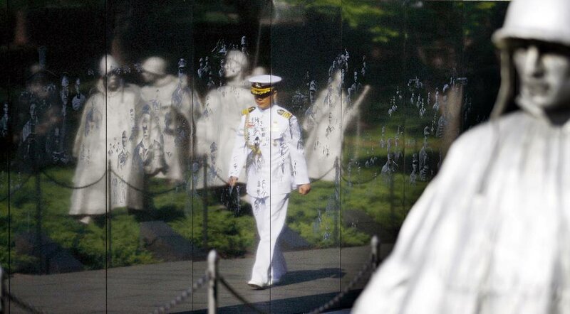 Naval Attache Sam-man Jung reflected in the wall walks through the Korean War Veterans Memorial before the arrival of South Korea president Lee Myung-bak in Washington on Friday, April, 18, 2008.(AP Photo/Jose Luis Magana)