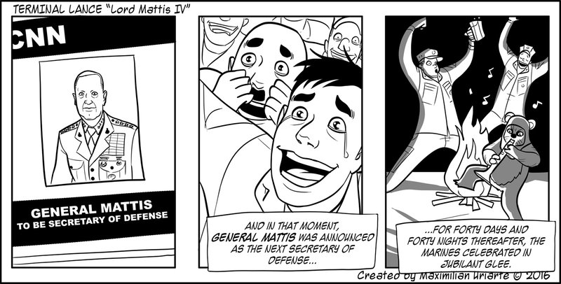Sgt Wayne Wood this came up in my twitter feed, and I had to laugh. I saw a news report that said there is a small issue with the nomination. There is an obscure law that requires the Secretary of Defense to be 7 years departed from the military to maintain civilian oversight of the military. As if General Mattis is going to suddenly not be a marine three years (as he is now) seven years, or ten years after his retirement from Active Duty. Once a Marine, always a Marine. I think it is stupid anyway. Why would you want someone removed from the military as secretary of defense? I hope Congress acts to make this happen as they did for Marshall.