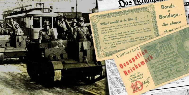 1. The front of the so-called If Day notes resembled a German 10-mark note, with 'Occupation Reichsmark' stamped in red as a clear message that Winnipeg was under German occupation.