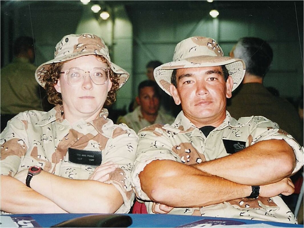 This is our “war face.” LOL We are proud ODS veterans. We deployed with the 4th Tactical Fighter Wing at Seymour Johnson AFB. My husband was a weapons loader on the F-15E Strike Eagles, the newest fighter in the inventory. We lost a jet on the first night of the war and one on the third night of the war. The first crew was KIA and the second crew was captured. I’ll never forget it.