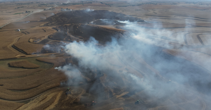 A large fire in a farm field recently brought together firefighters and a dozen farmers to fight the blaze near Emerson in far southwest Iowa.