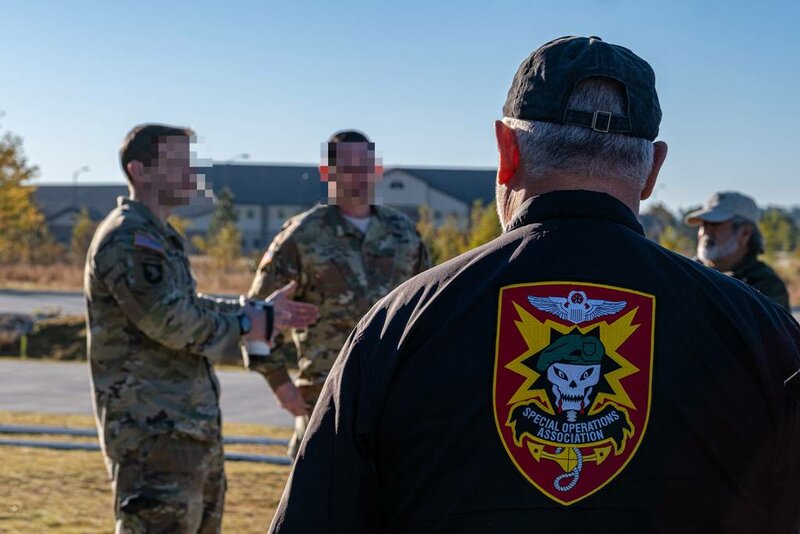 A Military Assistance Command, Vietnam-Studies and Observations Group, or MACV-SOG, veteran, listens to active service members with 3rd Special Forces Group (Airborne) as part of the MACV-SOG Heritage Week, Fort Bragg N.C., Nov. 9, 2021. (Sgt. Gavin J. Lewis/Army)