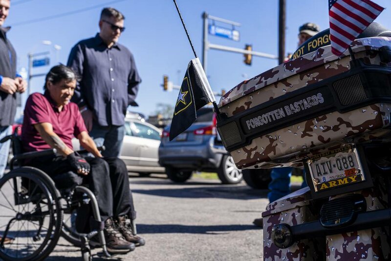 This Harley Davidson motorcycle was constructed as a tribute to the bravery and sacrifice of the veterans who served in Mogadishu, Somalia in 1993. Roland "Poncho" Carrizales (left), a Mogadishu veteran, was the first to sign the bike for Ed Ricord, the veteran who rebuilt the motorcycle, and his wife Laura Ricord plan to tour the country with the motorcycle to collect signatures from the remaining veterans and Gold Star Families, culminating in a presentation of the signed motorcycle to the 10th Mountain Division on the 30th anniversary of the battle. (Bethany Huff/Army)