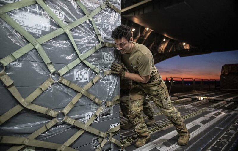 An airman loads cargo onto a C-17 Globemaster bound for Incirlik Air Base, Turkey, on Feb. 7. (Staff Sgt. Marco Gomez/Air Force)