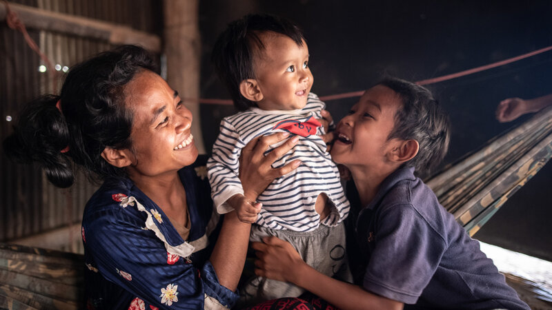 A ten-month-old girl, with a first flush of silky black hair and bathed in warm light, giggles as her cackling big brother gives her a hug. Her mother, Pho Sok, hoists the happy baby and beams at both children.