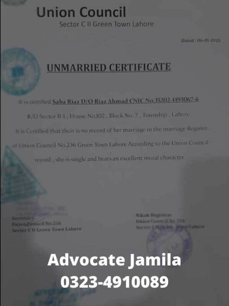 Unmarried Certificate in Pakistan - Advocate Jamila Ali