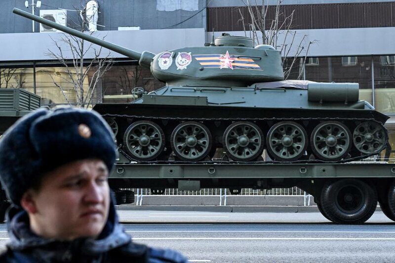 A T-34 tank is transported along the Garden Ring road toward Red Square for a rehearsal of the Victory Day military parade on May 4, 2022. (Kirill Kudryavtsev/AFP via Getty Images)