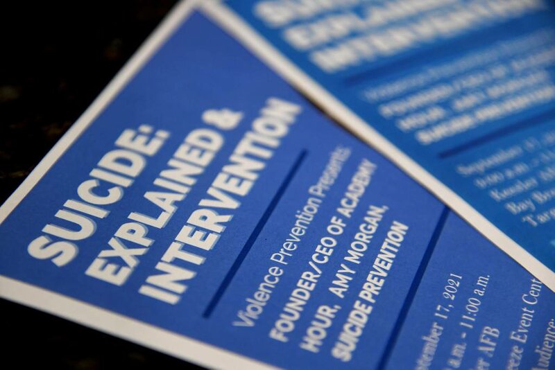 Flyers are on display during the Suicide Explained & Suicide Intervention training inside the Bay Breeze Event Center at Keesler Air Force Base, Mississippi, Sept. 17, 2021. With suicide being the leading cause of death in the Air Force, the presentation focus was to provide skill based training in primary prevention for personnel at Keesler. (Kemberly Groue/U.S. Air Force)
