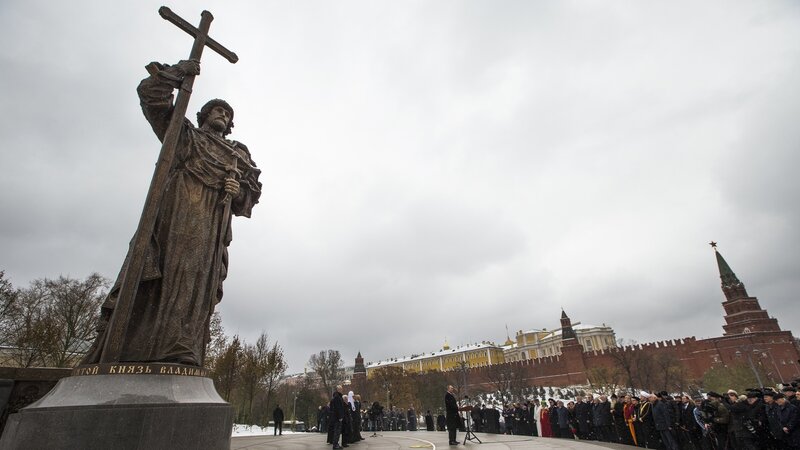 Yet Russia also claims him as central to its political and religious history. They know him by the Russian version of his name — Vladimir the Great. Six years ago, Russia built an even larger statue just outside the Kremlin walls.