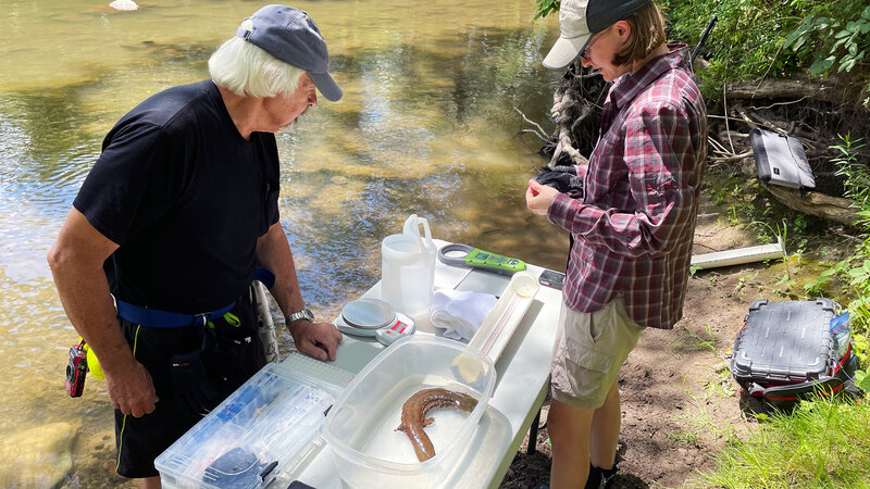 On a recent hot summer day, biologist Michelle Herman is carefully swabbing this kind of rare, giant salamander for invasive fungus by a tributary of the Susquehanna River. She is part of a small group of biologists, state wildlife technicians, and volunteers supporting the hellbender in this area, where their numbers have sharply declined.